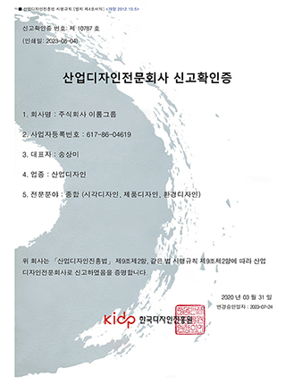 산업디자인전문회사 신고확인증