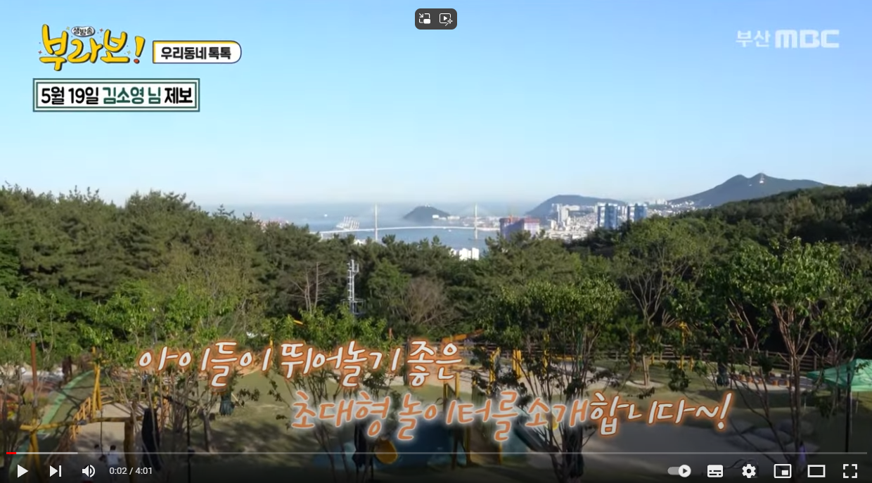 아이들이 뛰어놀기 좋은 초대형 놀이터, 넓이 약 20,000㎡의 숲속의 놀이터 수정산 꿈 자람터가 부산MBC 생방송 부라보 코너에 소개되었습니다. 많은 관심 부탁드립니다.출저 : 5월 '부산' 아이들이 좋아하는 다양한 문화·행사 / ...