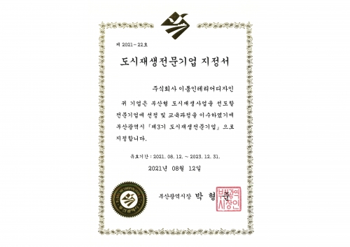 <(주) 이룸인테리어디자인, 부산시 도시재생전문기업에 선정되다 >(주) 이룸인테리어디자인이 2021년 부산광역시가 선정한 도시재생전문기업 물리적 재생분야(종합건설 업체, 전문건설업체 등)에 선정되었습니다. 기존 지자체...