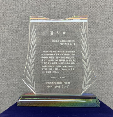 <(주) 이룸인테리어디자인, 카카오 VX 부산명지점 감사패 수여 > 당사는 (주)프렌즈아카데미 부산명지점으로부터성공적인 설계 및 시공으로 감사패를 수여받았습니다.