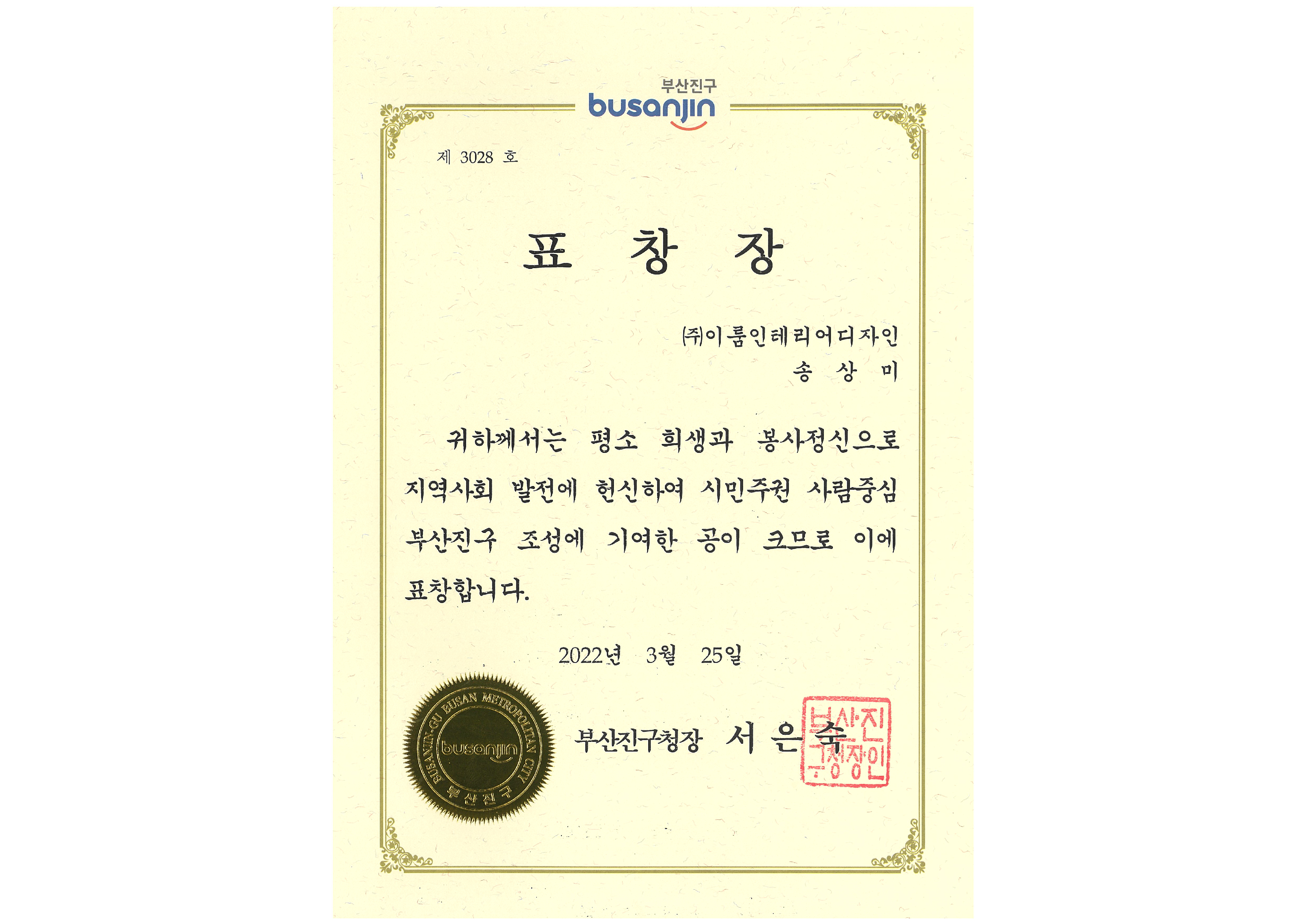 <(주) 이룸인테리어디자인, 부산 진구청장 표창장 수여 > 당사는 부산 진구청으로부터평소 희생과 봉사정신으로 지역사회 발전에 헌신하여 표창장을 수여받았습니다.